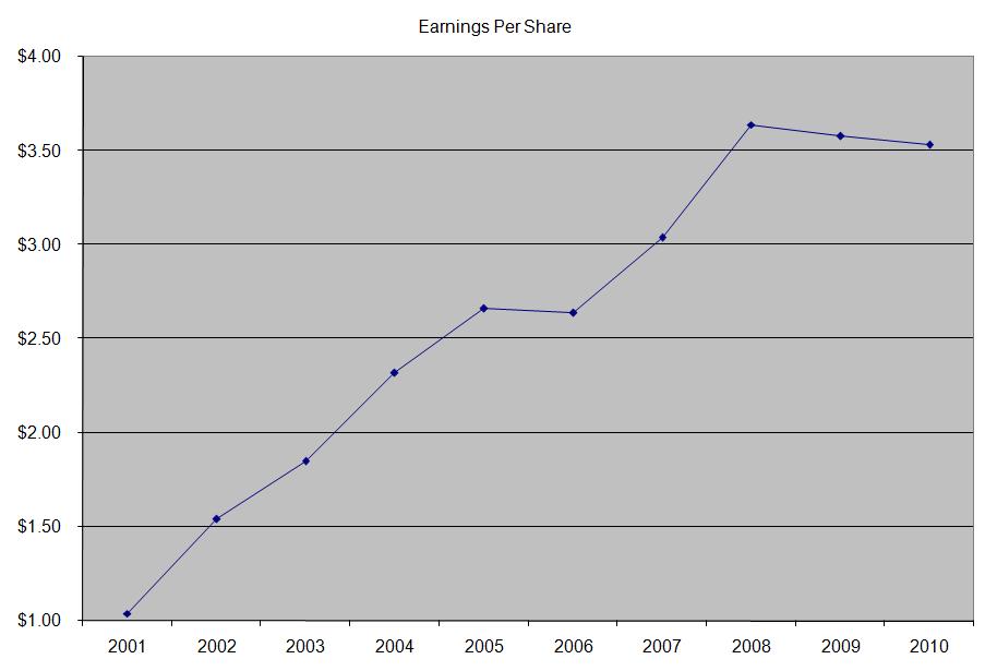 The company has managed to deliver an average increase in EPS of 14.50% per year since 2000. Analysts expect Procter & Gamble to earn $3.98 per share in 2011 and $4.37 per share in 2012. This would be a nice increase from the $3.53/share the company earned in 2010.
