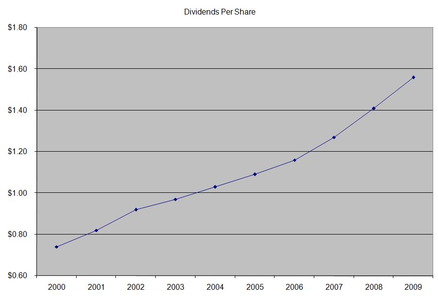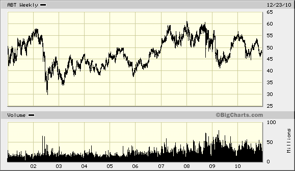 The company has managed to deliver an average increase in EPS of 8.40% per year since 2000. Analysts expect Abbott Laboratories to earn $4.17 per share in 2010 and $4.66 per share in 2011. This would be a nice increase from the $3.69/share the company earned in 2009. The growth would come from increase in sales in rheumatoid arthritis and psoriatic arthritis drug Humira, cholesterol treatment drug Niaspan and the Xience drug eluting stent. The company’s growth is also dependent on the successful integration of the pharmaceuticals unit that it purchased from Solvay for $6.2 billion in 2010, which included Abbott with the cholesterol drugs Tricor and Trilipix.