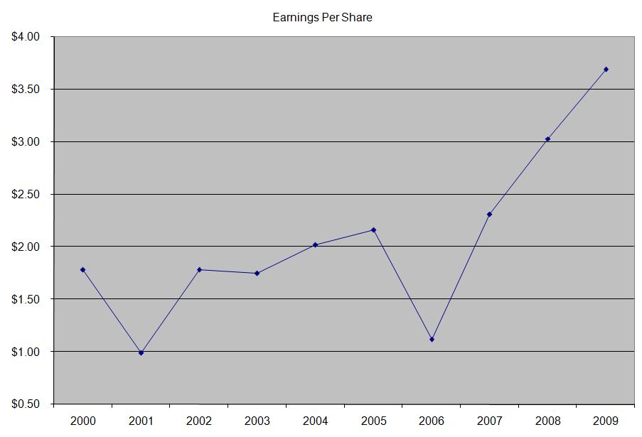 The company has a high return on equity, which has remained above 20%, with the exception of a brief decrease in 2001 and 2006. Rather than focus on absolute values for this indicator, I generally want to see at least a stable return on equity over time.