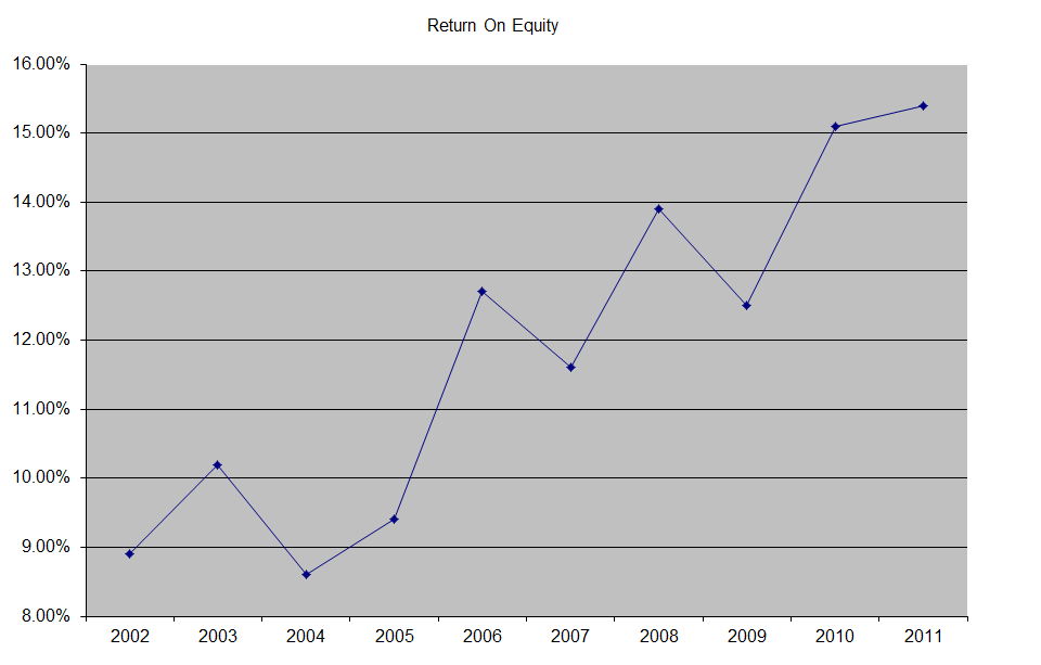 Casey’s has managed to earn a higher return on equity over the past decade. In fact, this indicator increased from 9% in 2002 to 15.40% in 2011. Rather than focus on absolute values for this indicator, I generally want to see at least a stable return on equity over time.
