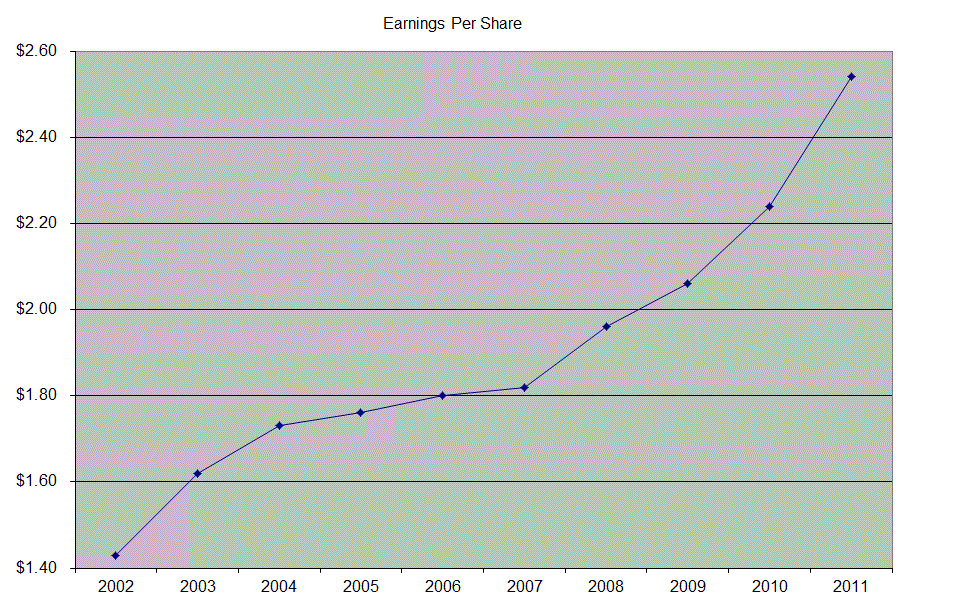 The dividend payout ratio has increased over the past decade, rising from a low of 12.50% in 2002 to almost 23% in 2011. This explains the fact that dividend growth has been faster than earnings growth over the past decade. A lower payout is always a plus, since it leaves room for consistent dividend growth minimizing the impact of short-term fluctuations in earnings.