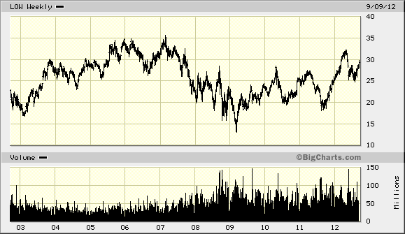 The company has managed to generate a 5% average increase in annual EPS since 2003. Analysts expect Lowe’s to earn $1.65 per share in 2013 and $2.01 per share in 2014. In comparison, the company earned $1.44 per share in 2012.