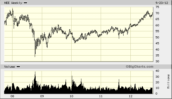 The company has managed to deliver an 8% average increase in annual EPS since 2003. Analysts expect NextEra Energy to earn $4.54 per share in 2012 and $4.95 per share in 2013. In comparison, the company earned $4.59 per share in 2011. The company has been able to generate a high growth on earnings, which is something very rare for a utility.