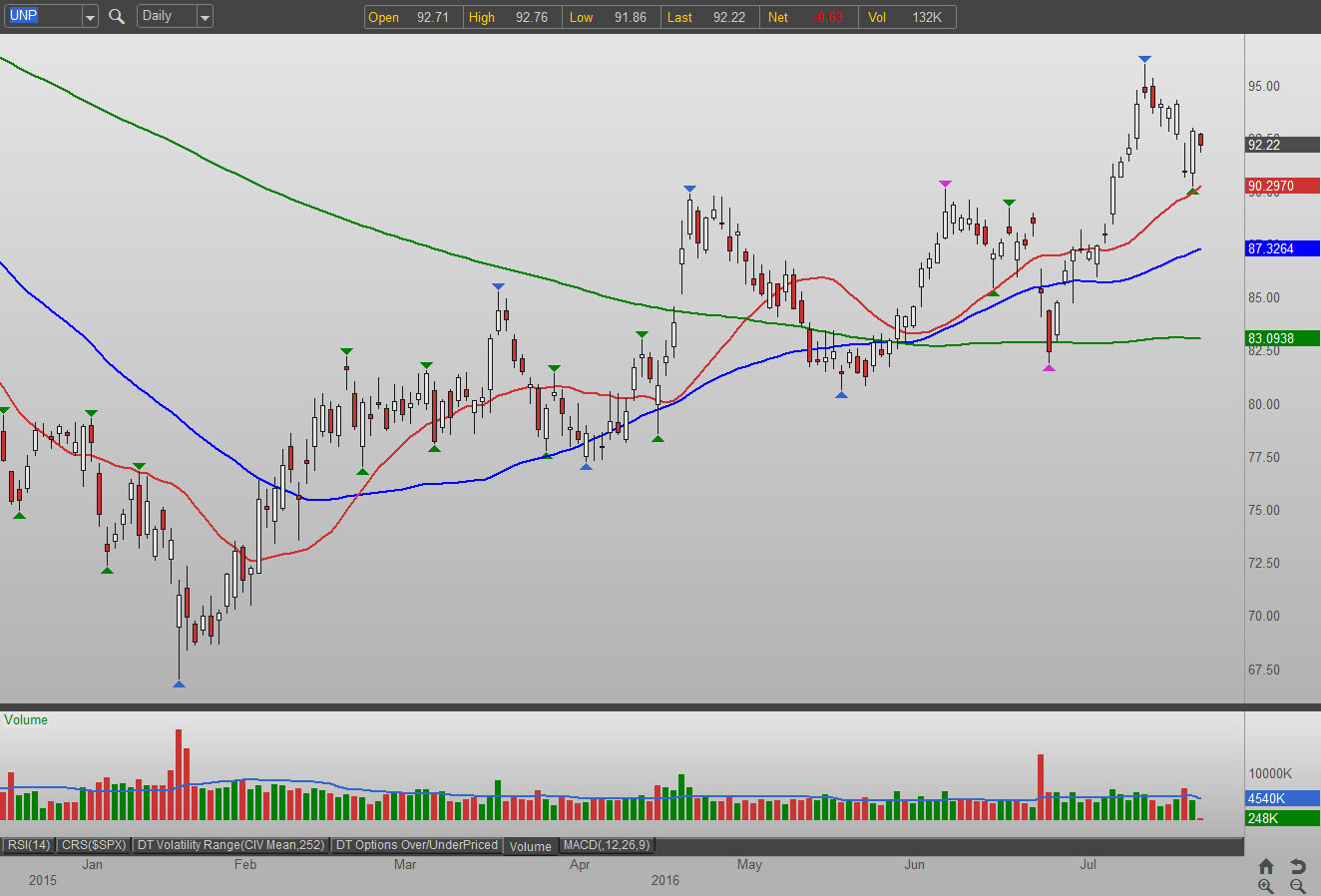 Union Pacific shares are trading near their 52-week high, yet don’t look overbought. The stock’s price/earnings-to-growth ratio of 1.1 is about right for the sector.