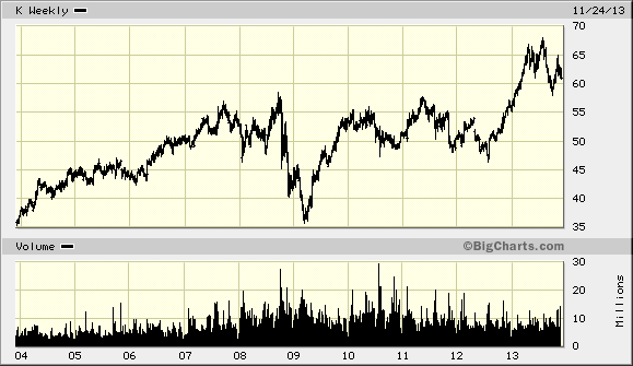 Kellogg (K), together with its subsidiaries, manufactures and markets ready-to-eat cereal and convenience food products primarily in North America, Europe, Latin America, and the Asia Pacific. The company has paid dividends since 1925 and has increased them for nine years in a row. Between 1960 and 2001, the company had raised annual dividends every year.