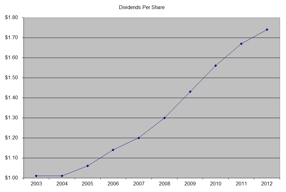 The dividend payout ratio has increased from 52% in 2003 to almost 65% in 2012. Looking at estimated earnings for 2013 however, the forward dividend payout ratio is 49%. A lower payout is always a plus, since it leaves room for consistent dividend growth minimizing the impact of short-term fluctuations in earnings.