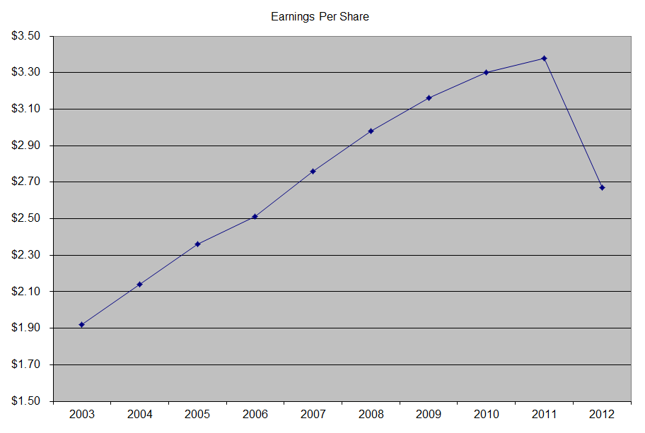 The company has managed to deliver a 3.70% average increase in annual EPS between 2003 and 2012. The company is expected to earn $3.77 per share in 2013 and $4.06 per share in 2014. In comparison, the company earned $2.67 per share in 2012. The low earnings were the result of a one-time accounting hit of 85 cents per share, related to a change in accounting for pensions.