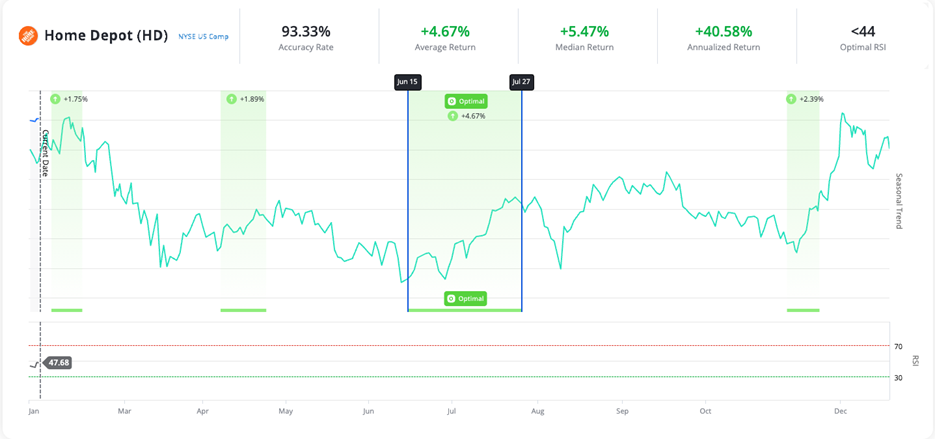 Over the last 15 years, between June 15 and July 27, Home Depot’s share price has risen 93% of the time, with an average return of 4.7%.
