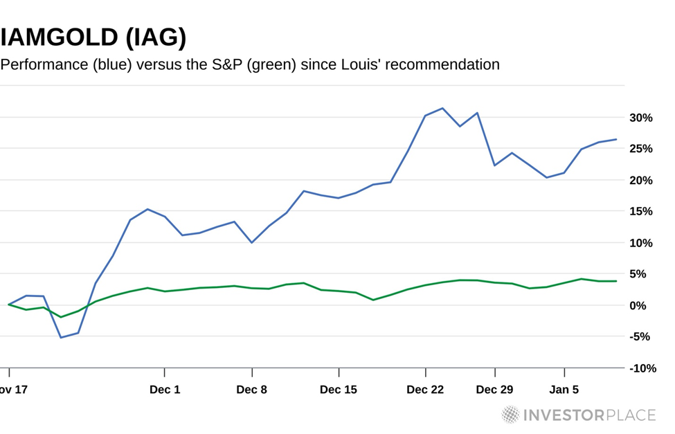 In November, Louis recommended IAMGOLD (IAG) to his Accelerated Profits subscribers, arguing that not only gold prices but earnings were the primary reasons for the pick.