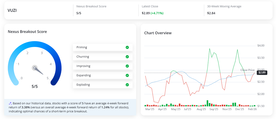 Here’s an example, using augmented reality smart glasses company Vuzix (VUZI). It gets a “5” today, meaning it is highly primed for a breakout.