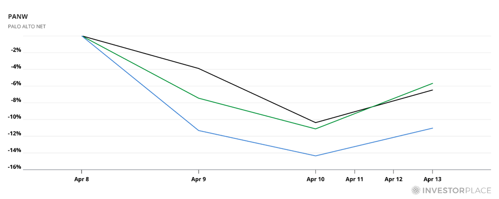 As you can see below, Palo Alto Networks (PANW) immediately fell about 10%, while CrowdStrike (CRWD) dropped 11% and Zscaler (ZS) shed 14%.