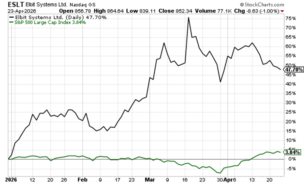 He recommended Elbit Systems, Ltd. (ESLT) long before Operation Epic Fury. Since the initial recommendation, the stock is up more than 128%, but year to date, the stock is up 48% compared to the market’s 4% gain.