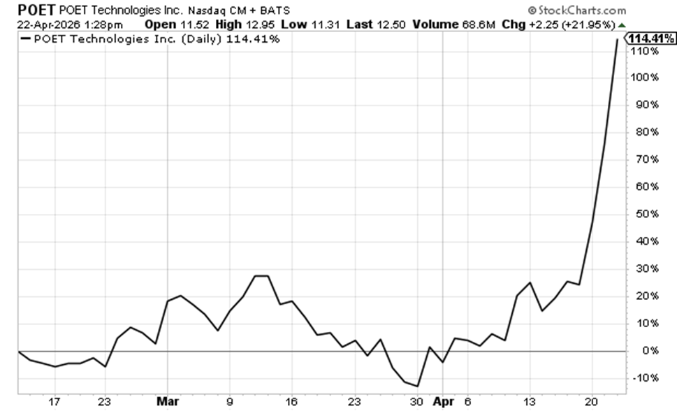 That’s roughly what you’d be sitting on if you’d acted on our February 12th Digest when we profiled a trade on POET Technologies Inc. (POET) – a small semiconductor company positioned at the center of the AI infrastructure boom.