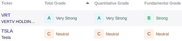 And when you run both companies through that system, the difference becomes clear. Vertiv Holdings earns an “A” rating, meaning “Very Strong,” while Tesla earns a “C” rating or “Neutral.”