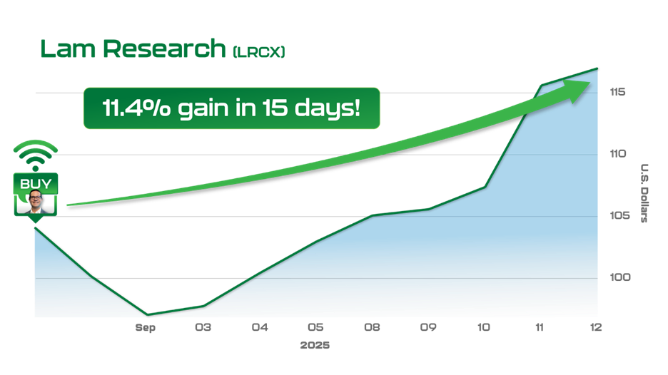 When the signal fired on August 28, 2025 — two trading days before Labor Day — LRCX gained 11.4% in 15 days.