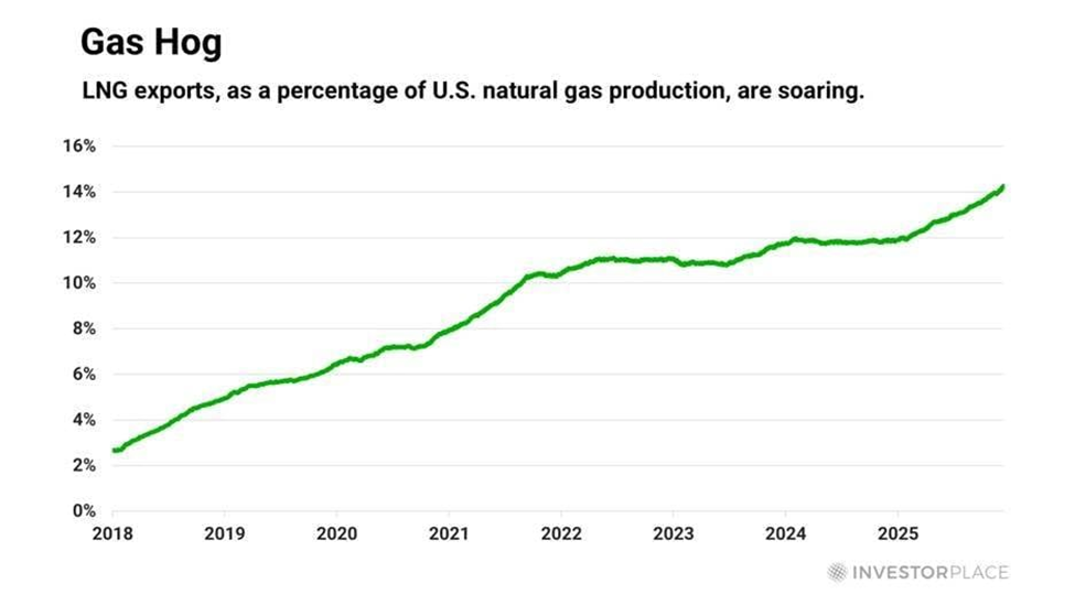 The United States has become the world’s largest LNG exporter. LNG plants along the Gulf Coast now absorb more than 14% of total U.S. natural gas production and ship it to destinations in Europe and Asia. And as the chart below shows, these exports keep rising.