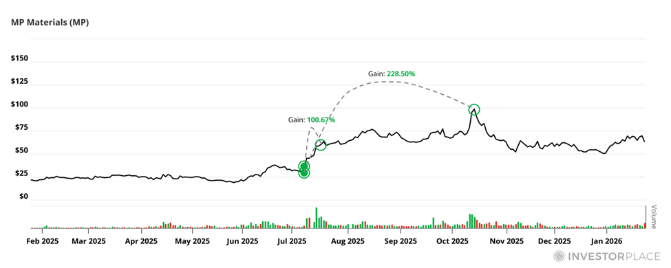 After MP announced its partnership with the Department of Defense on July 10, 2025, the stock shot up 100% in just seven days. From peak to trough over the past six months, MP gained close to 230%.