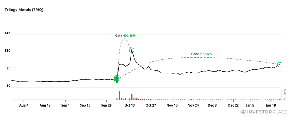 From October 6, when the government invested in TMQ, to October 14, the stock shot up 407%! Even if you missed that initial surge, it’s still up 200%-plus since.